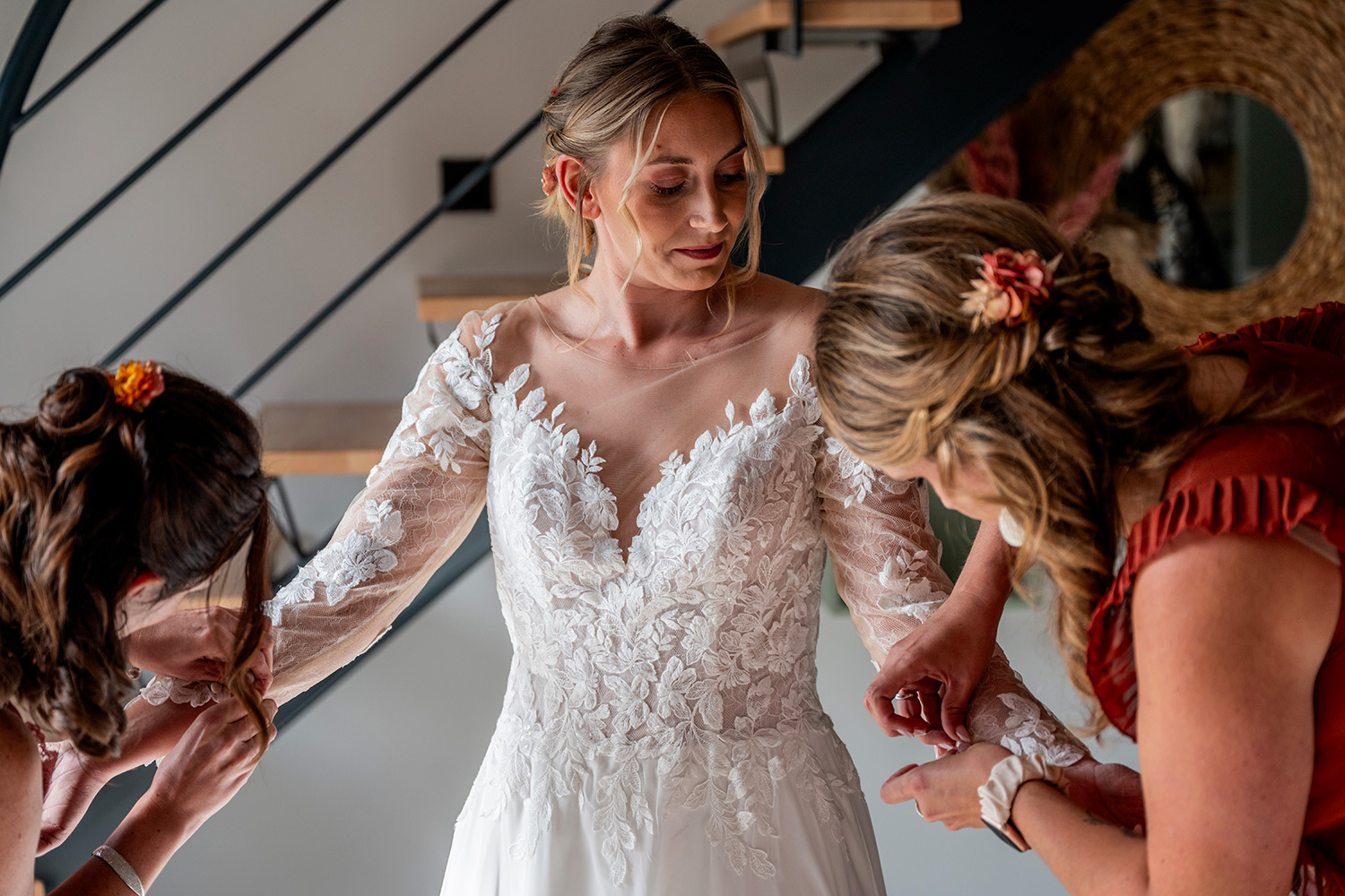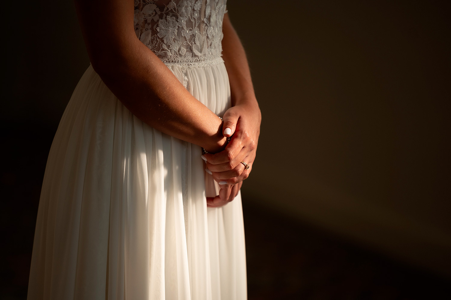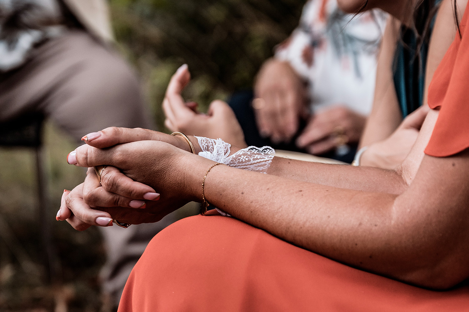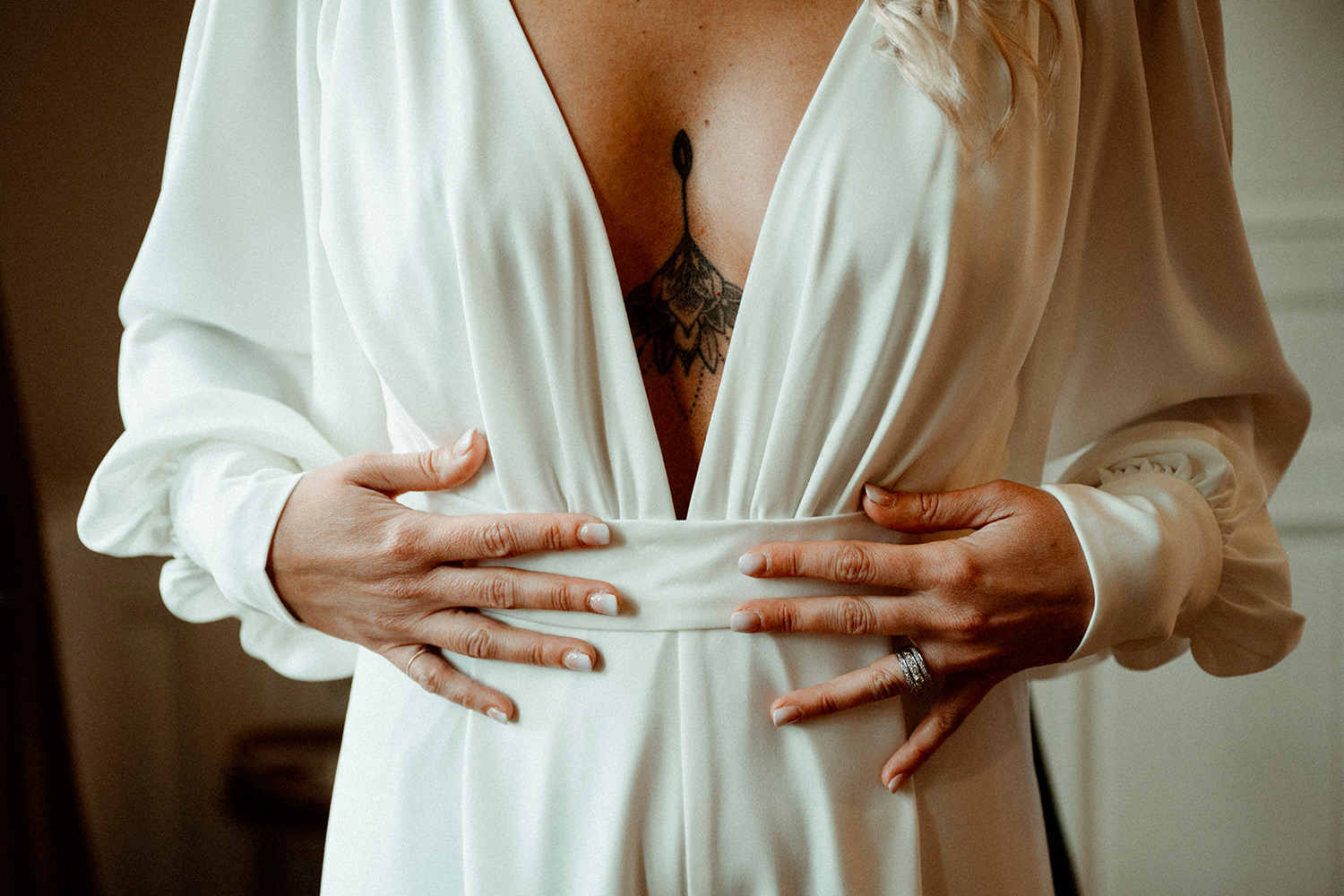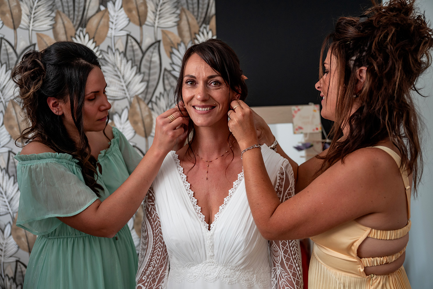 Les respirations profondes, les derniers détails ajustés, les regards échangés avec vos proches. C’est un moment suspendu, intime, rempli d’une douce tension. Les émotions montent sans encore déborder.