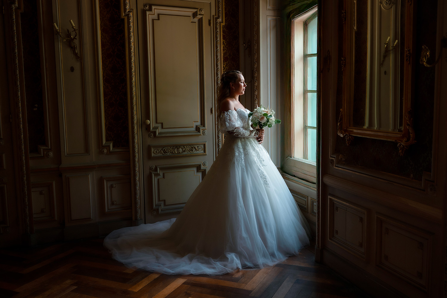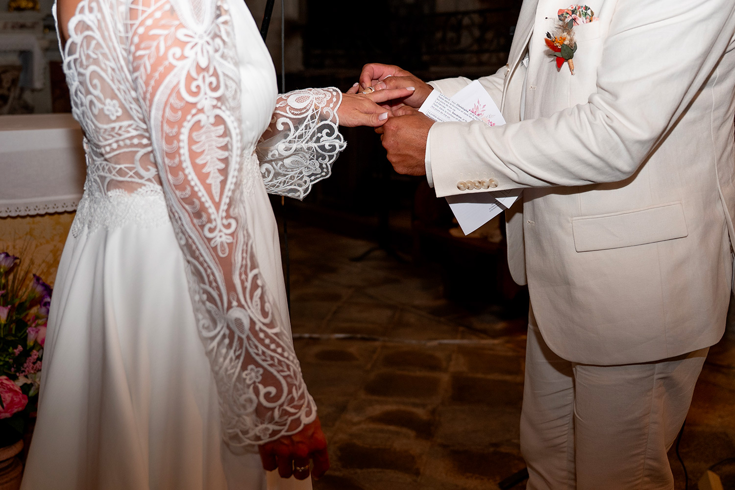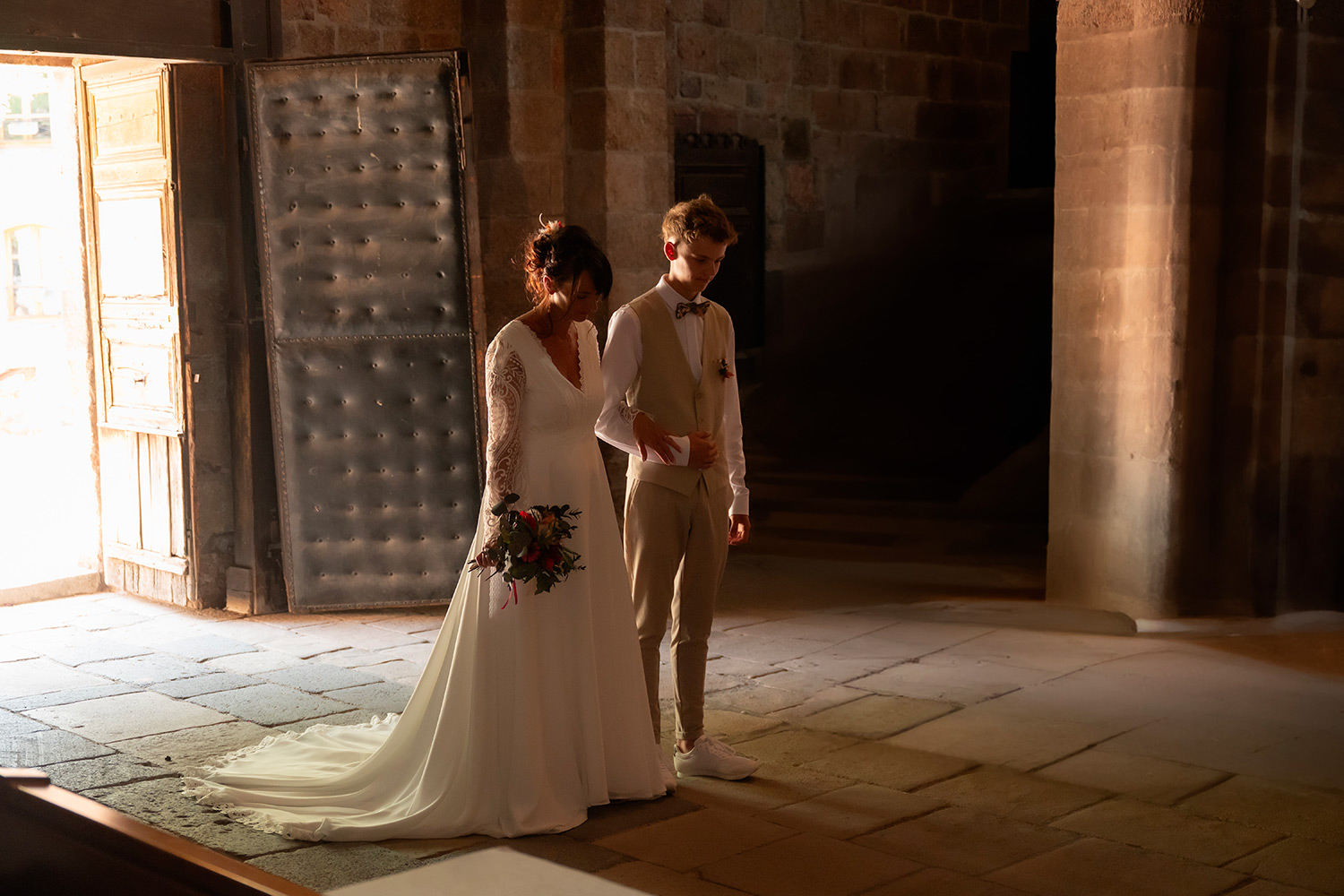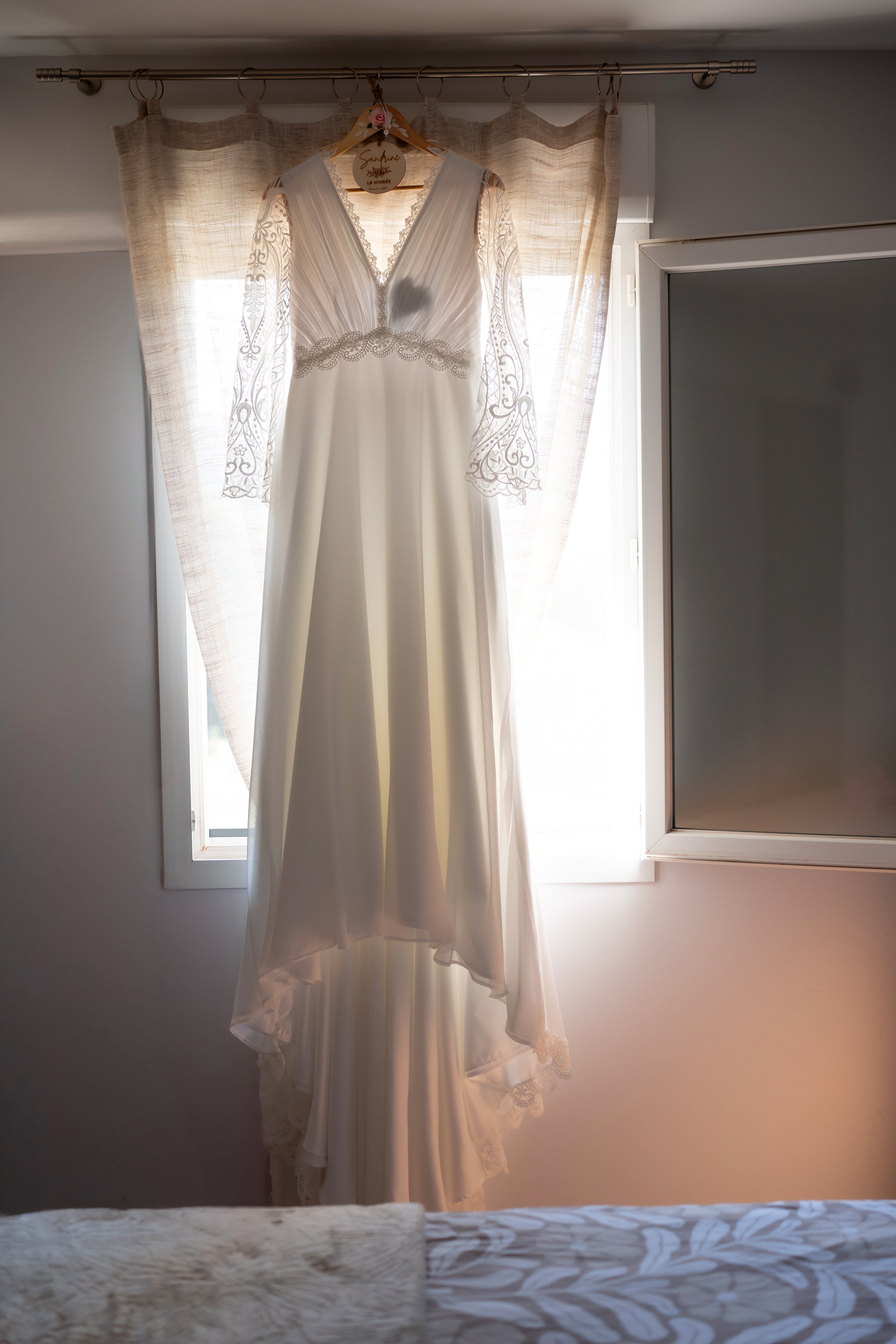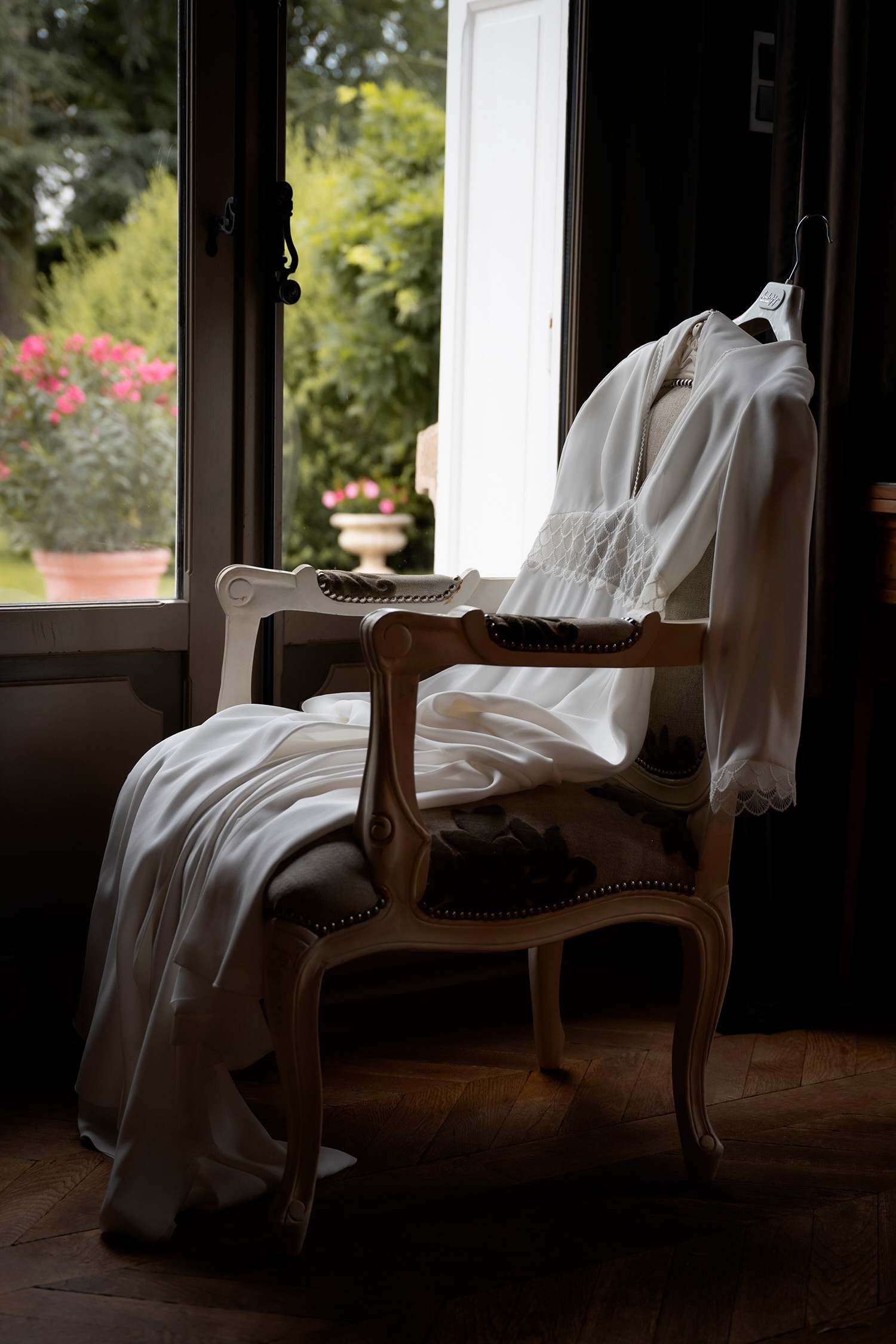 Les respirations profondes, les derniers détails ajustés, les regards échangés avec vos proches. C’est un moment suspendu, intime, rempli d’une douce tension. Les émotions montent sans encore déborder.