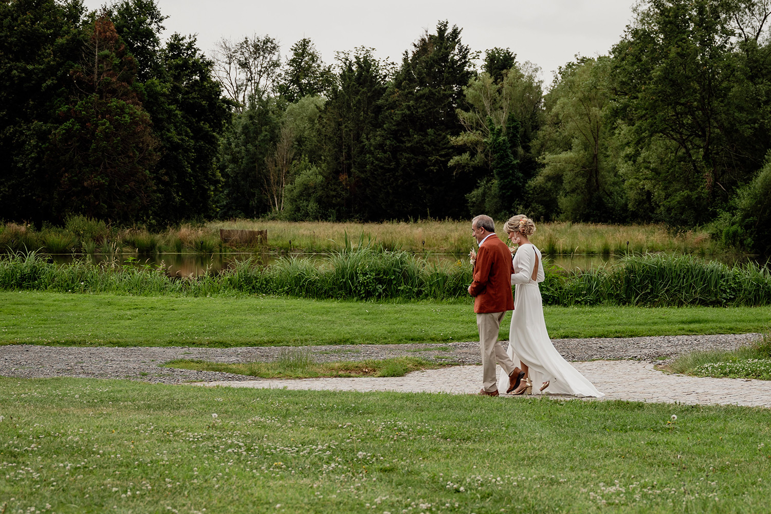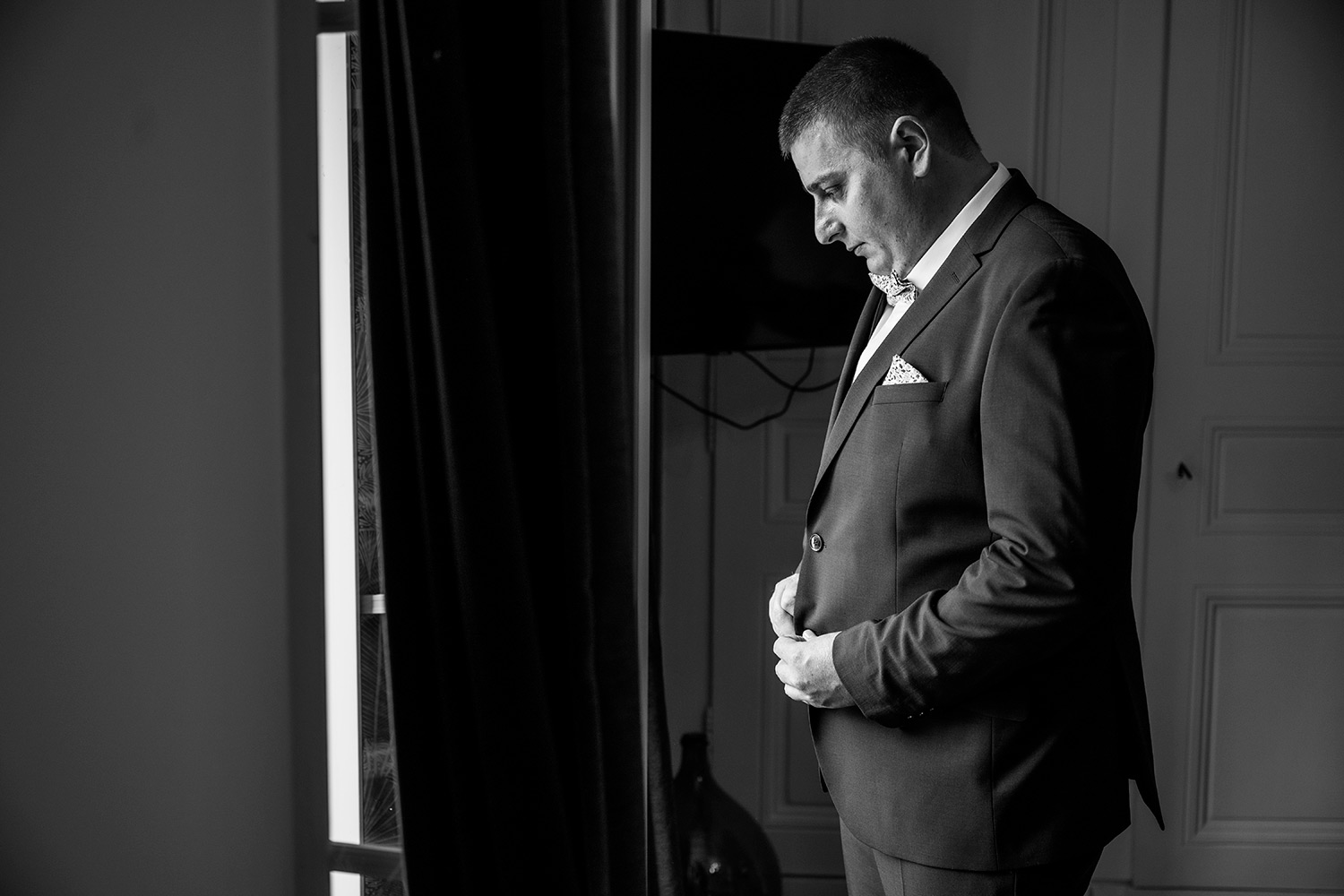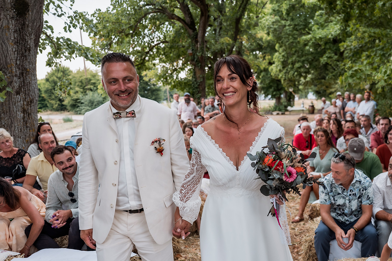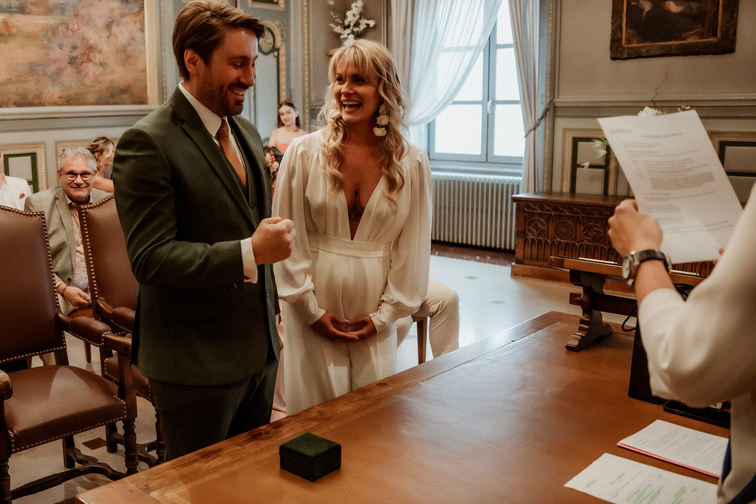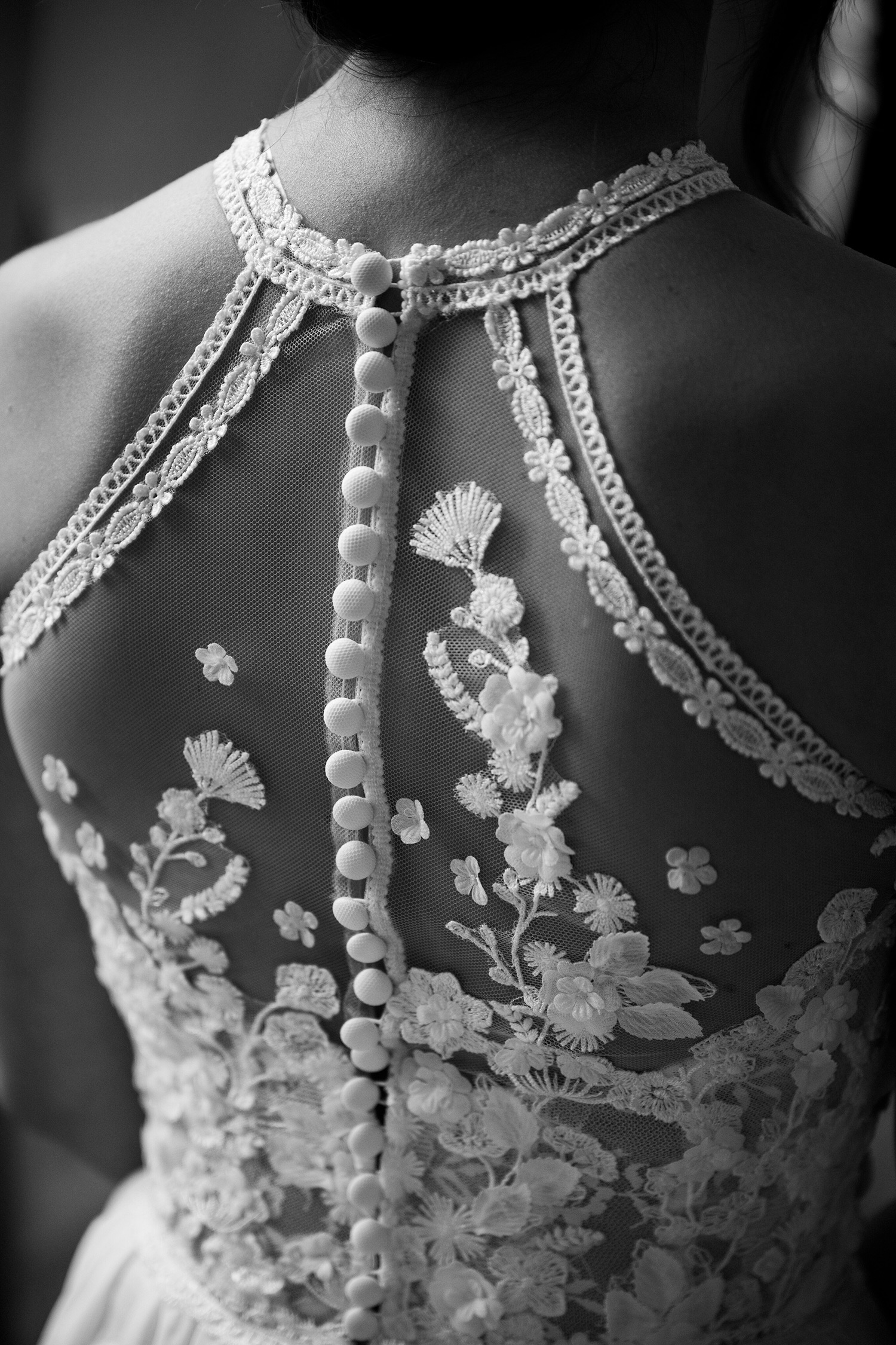 Les respirations profondes, les derniers détails ajustés, les regards échangés avec vos proches. C’est un moment suspendu, intime, rempli d’une douce tension. Les émotions montent sans encore déborder.
